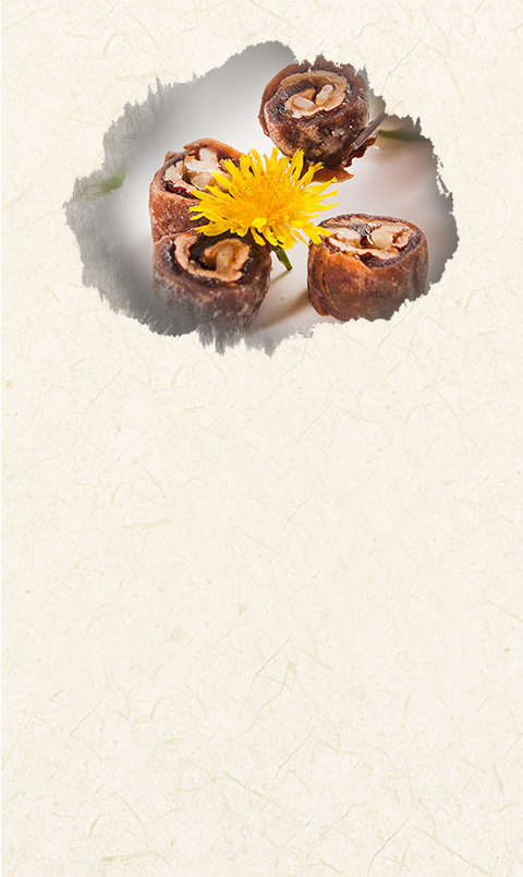 주머니 곶감에 호두를 넣고말아 얇게 썰면 예쁜 생김새의 곶감쌈이 된다.